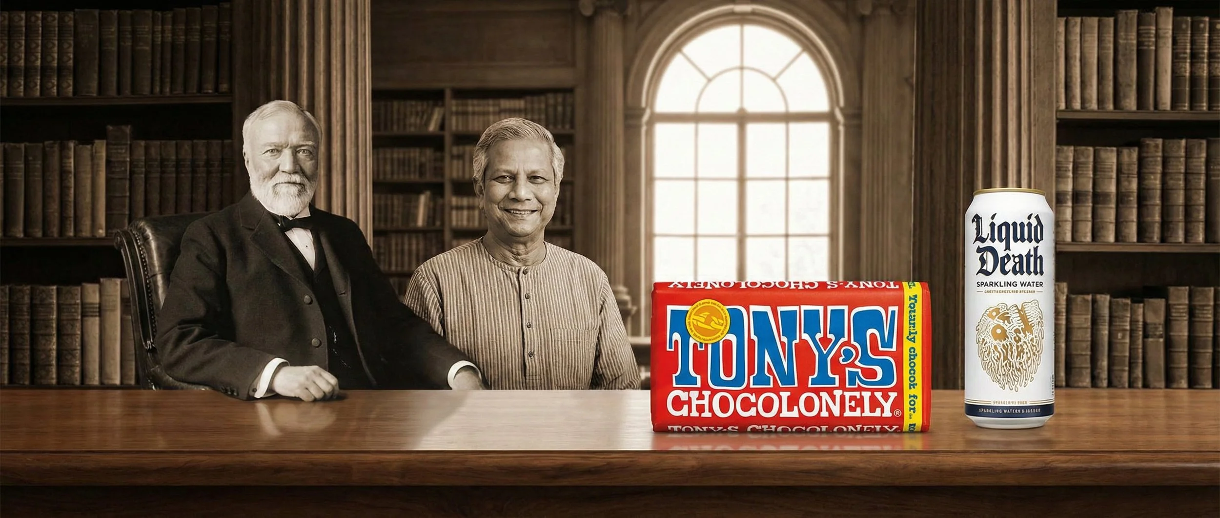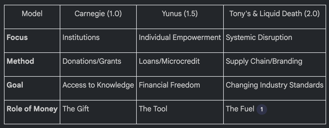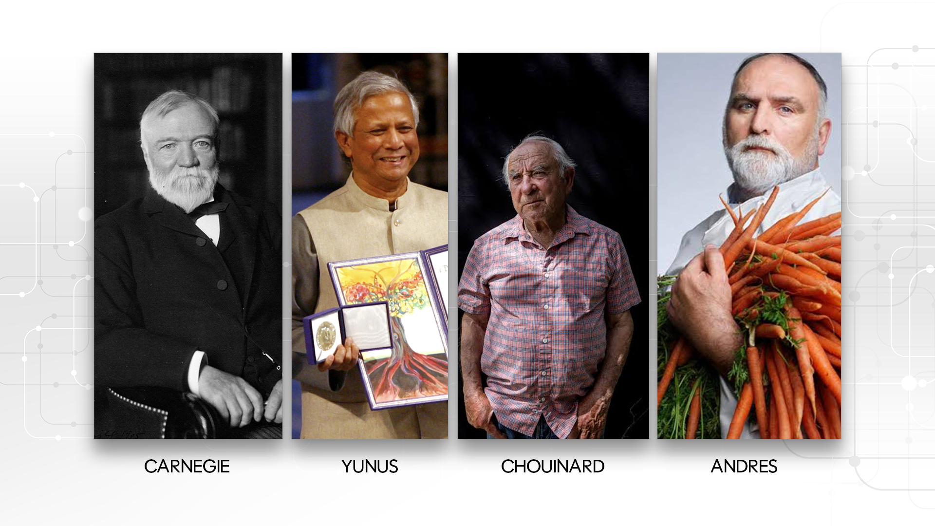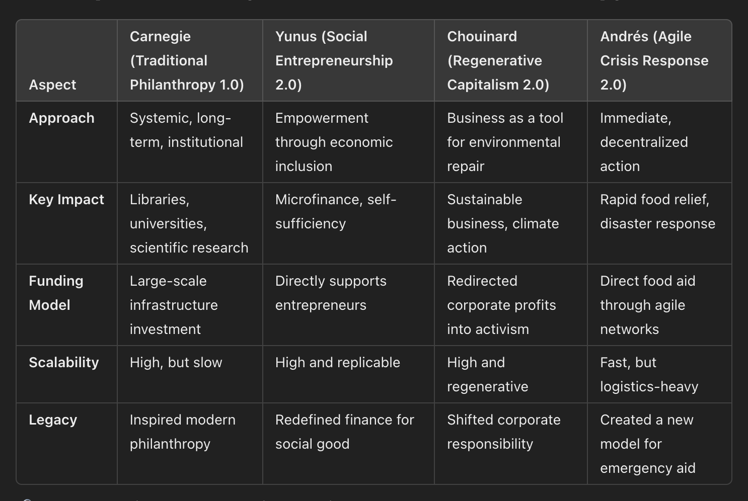 This image represents the evolution of philanthropy from traditional institutional giving to modern social entrepreneurship and regenerative impact models. Andrew Carnegie (left) symbolizes the Gilded Age model of philanthropy, focused on funding infrastructure like libraries and universities to provide long-term societal uplift. Muhammad Yunus (second from left) pioneered social entrepreneurship through microfinance, empowering underserved communities with sustainable financial independence. Yvon Chouinard (second from right) embodies regenerative capitalism, ensuring Patagonia’s profits serve environmental sustainability instead of shareholder wealth. José Andrés (right) represents agile crisis response philanthropy, revolutionizing humanitarian aid through World Central Kitchen, which rapidly mobilizes food relief in disaster zones. Together, they illustrate how philanthropy has evolved from top-down giving to systemic, entrepreneurial, and immediate-impact models that reshape the future of social change.